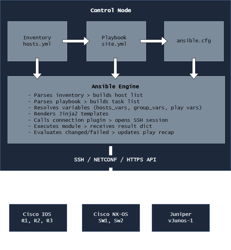 The single most important thing to understand about this architecture is that the control node does all the work. My Ubuntu VM is where Python runs, where SSH sessions are opened, where Jinja2 templates are rendered, and where results are processed. The network devices just receive CLI commands over SSH and send back text output. This is fundamentally different from how Ansible manages Linux servers (where it uploads and runs Python on the remote machine). Understanding this distinction explains why network playbooks use connection: network_cli and gather_facts: false (there’s no Python on a Cisco router to run facts gathering).