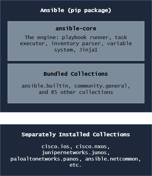 pip install ansible installs ansible-core plus a curated set of ~85 community collections. This is what most people mean when they say “install Ansible.”